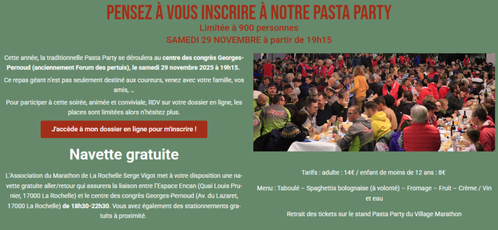 Cette année, la traditionnelle Pasta Party se déroulera au centre des congrès Georges-Pernoud (anciennement Forum des pertuis), le samedi 29 novembre 2025 à 19h15.