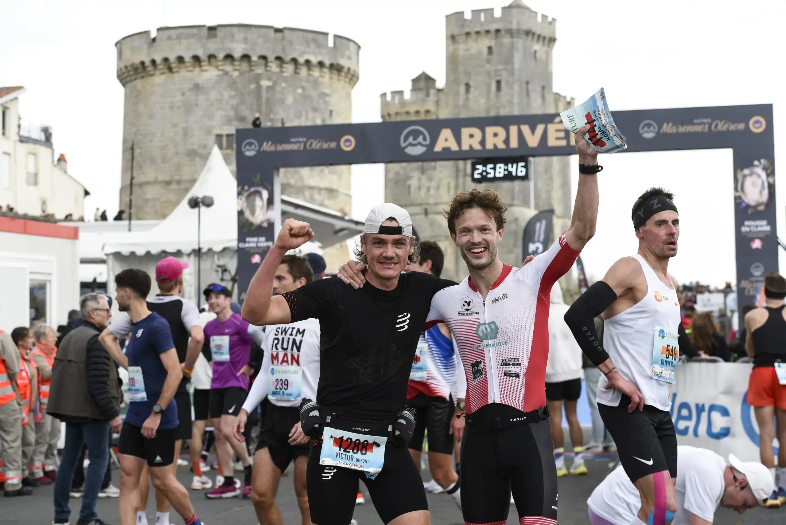 - Quels sont les lots pour les finishers ?Les lots pour les finishers diffèrent en fonction de la course : Marathon : - 1 bourriche d'huîtres Marennes Oléron, - 1 coupe-vent collector de l'édition, - 1 médaille de l'édition, Marathon Duo (récupérés par le 2ème relayeur): - 2 tee-shirts, - 2 médailles qui s'assemblent, 10Km : - 1 tee-shirt, Challenge Entreprises (le pack récompenses est récupéré au retrait des dossards): - 4 tee-shirts marqués avec le nom de l'équipe, - Un pack de récompenses diverses.