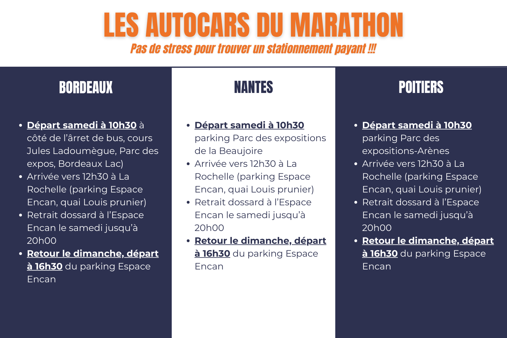 Grâce aux parkings relais (P+R), évitez les difficultés de circulation et profitez du stationnement gratuit pour les coureurs. Pour faciliter vos déplacements entre les parkings relais et le centre ville, 3 navettes gratuites pour les coureurs sont mises en place pour le dimanche 29 novembre : Navette Sud P+R Simone Veil, Navette Nord P+R Les Greffières et Vieljeux et Navette Nord Parking centre commercial Beaulieu avec des liaisons avant et après la course (les horaires seront communiqués mi-novembre)